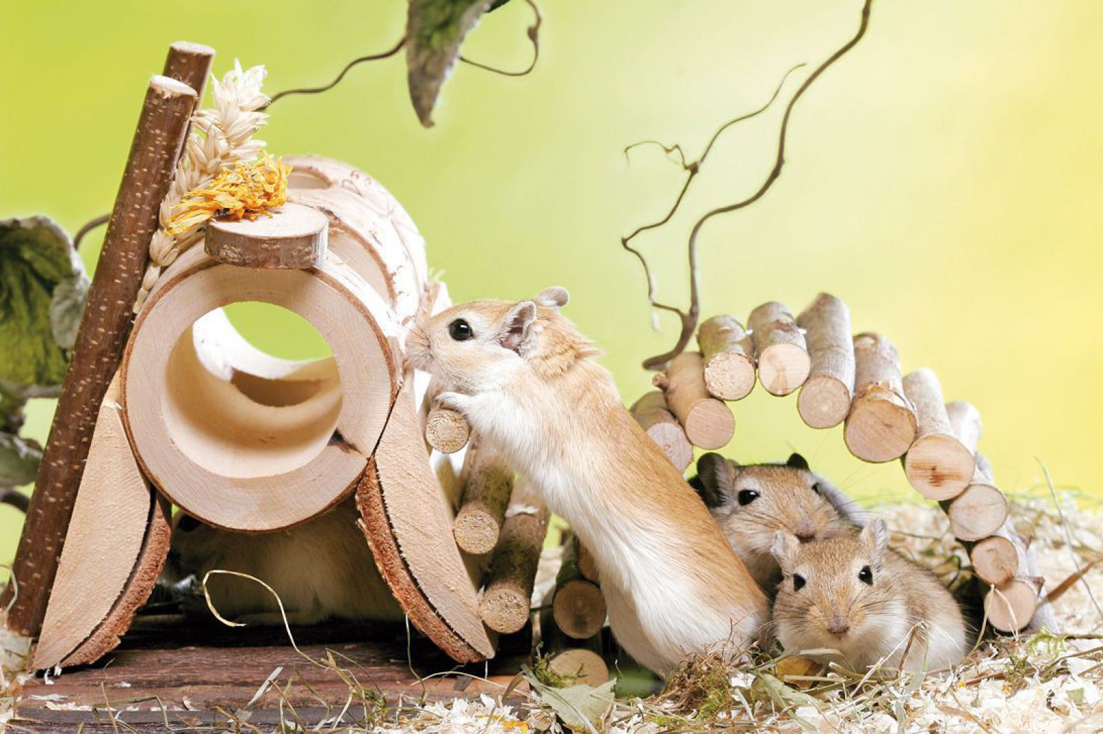 Achtung: Steine und andere schwere Einrichtungsgegenstände müssen stabil auf den Gehegeboden gestellt werden, bevor die Einstreu eingefüllt wird. Andernfalls kann es passieren, dass die Rennmäuse den Stein untergraben und erdrückt werden. Zur Bereicherung des Alltages soll mehrmals pro Woche frisches Nage- und Baumaterial angeboten werden. Geeignet sind beispielsweise Zweige, langfaseriges Heu und unparfümiertes Klopapier. Die Tiere zerkleinern das Material schnell, verwenden es zum Nestbau oder arbeiten es in die Einstreu ein. Auf diese Art wird die Einstreu auch für den Bau eines Tunnelsystems stabiler. Da Rennmäuse nur sehr wenig Harn absetzen, ist der Reinigungsaufwand für den Käfig sehr gering. Die Einstreu muss nur alle 1-3 Monate gewechselt werden.