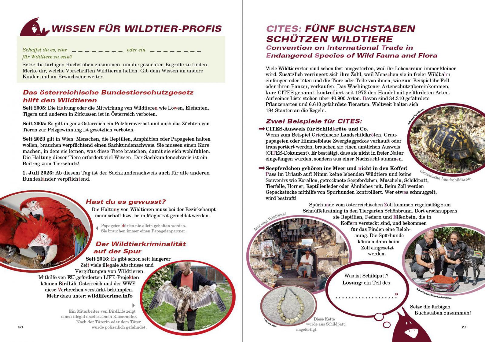 Das Heft ermöglicht es Schülerinnen und Schülern, die Welt aus der Perspektive von Wildtieren zu sehen. Beim Würfelspiel „Gefährliche Pfade für Wildtiere“ können sie ihre Umgebung aus der Sicht von Igel, Eichhörnchen und Erdkröte beurteilen und im Abschnitt „Tierschutz im Garten“ erfahren sie, wie Gefahren für Wildtiere durch einfache Maßnahmen, wie zum Beispiel Ausstiegshilfen aus Pools, entschärft werden können. Das Material offenbart, was Wildtierkriminalität bedeutet und wie Elefanten, Seepferdchen & Co. durch Zollkontrollen am Flughafen Schwechat geschützt werden. Es geht der Frage nach, ob es Tierschutz bei der Jagd und beim Angeln gibt und zeigt, worauf die Kinder bei Flugshows mit Greifvögeln und bei Zoobesuchen achten sollen. Das richtige Verhalten bei Begegnungen mit Wildtieren kann mit einem Test überprüft werden. Der Comic-Vogel Fredy Feder führt durch die spannenden Seiten, die vielen Rätselaufgaben enthalten.